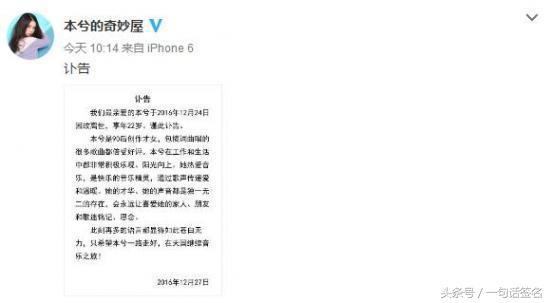 今日,本兮工作室发讣告,表示本兮于2016年12月24日因故离世。