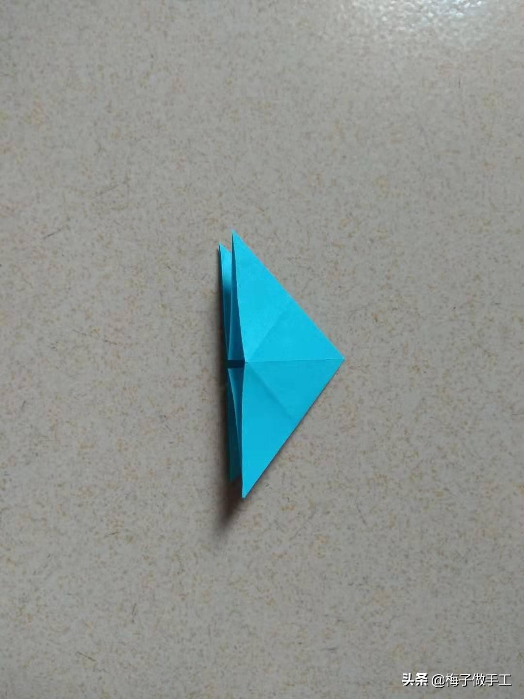 第四步:把第一层三角形沿着两腰中线对折,然后把左右两边翘起部分向下按照折痕压平;第二层折法一样 。