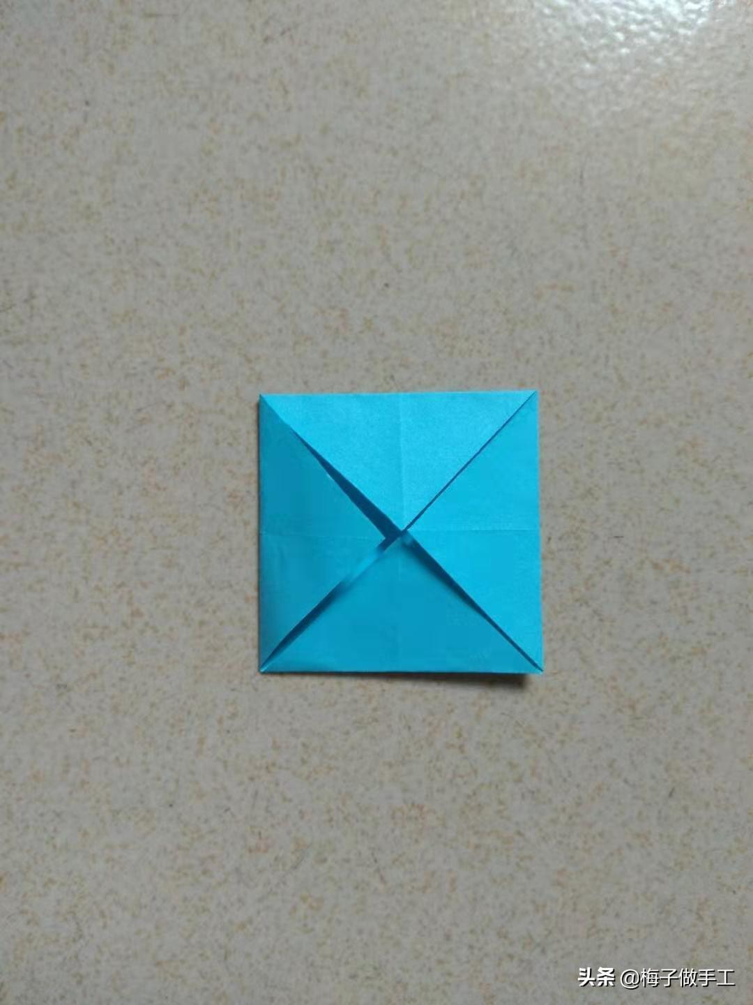 第二步:把四个角分别向中心点翻折,然后展开得到折痕。