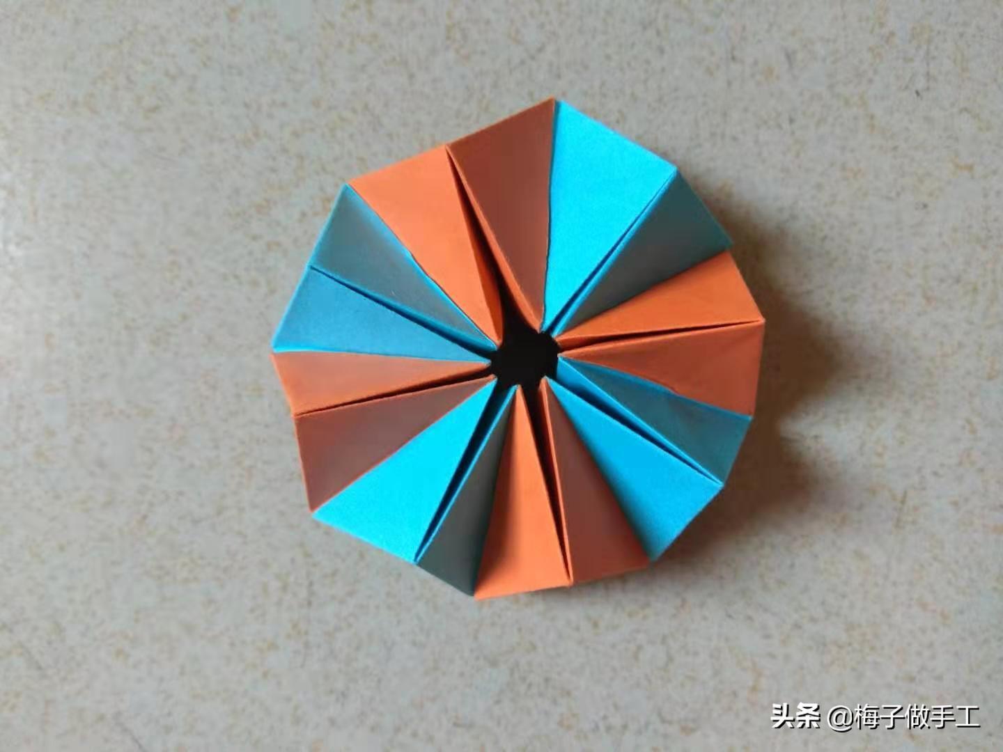 第九步:把最后一个插入第一个折好,收尾连接,形成一个圆形。一个百变折纸魔方就做好了。