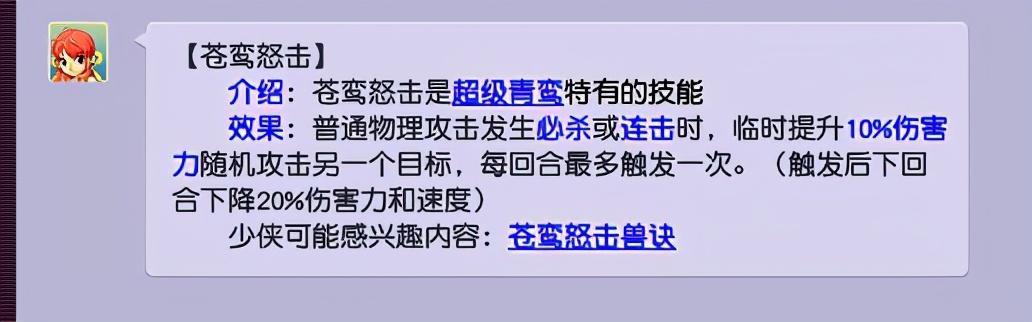 苍鸾怒击是神兽超级青鸾的特有技能,效果:普通物理攻击发生必杀或者连击时,临时提升10%伤害力,随机攻击另外一个目标,每回合最多可以触发一次。触发后,下回合下降20%的伤害力和速度。