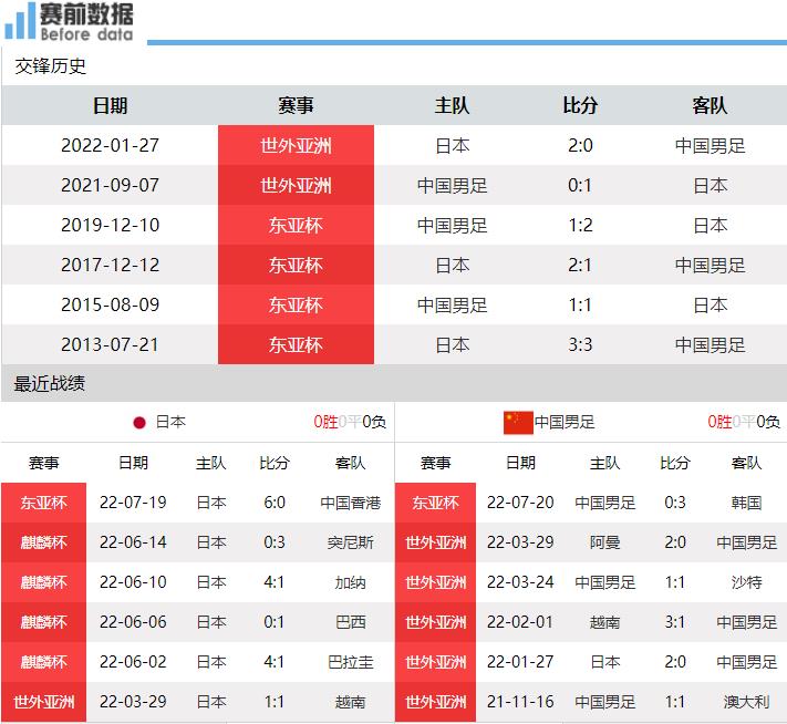 第一:两队情况!东亚杯第一轮,日本6-0横扫中国香港;中国男足0-3惨败给韩国,国足全场仅1次射门,比分不是很惨,过程让中国球迷感到绝望,国足主动放弃进攻,完全处于被动挨打的局面。国足平均年龄22.6岁,身价合计582万欧元;日本队平均年龄25.2岁,身价合计2335万欧元。日本队虽然是全本土球员组成的,但这些边缘球员渴望用好的发挥来确保自己参加世界杯,因此他们肯定会拼尽全力。