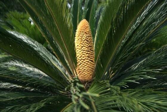 铁树当然开花,只是很少人见到铁树开花,铁树花分为磁性和雄性,雄性花是圆柱形,像一个巨大的玉米芯,刚开放时呈鲜黄色,成熟后渐渐变成褐色。雌铁花是半球形,像一个大绒球最初是灰绿色,以后也会变成褐色。