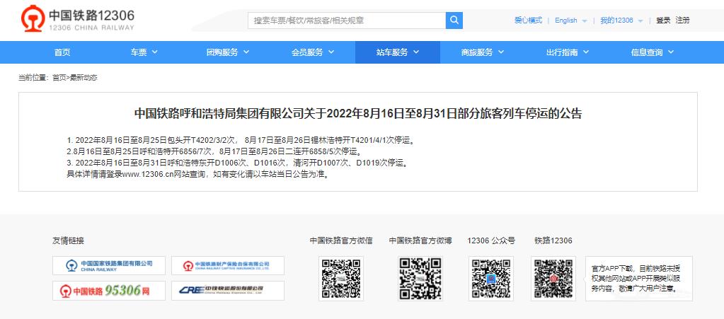 中国铁路呼和浩特局集团有限公司关于2022年8月16日至8月31日部分旅客列车停运的公告1. 2022年8月16日至8月25日包头开T4202/3/2次, 8月17日至8月26日锡林浩特开T4201/4/1次停运。2.8月16日至8月25日呼和浩特开6856/7次,8月17日至8月26日二连开6858/5次停运。3. 2022年8月16日至8月31日呼和浩特东开D1006次、D1016次,清河开D1007次、D1019次停运。具体详情请登录www.12306.cn网站查询,如有变化请以车站当日公告为准。