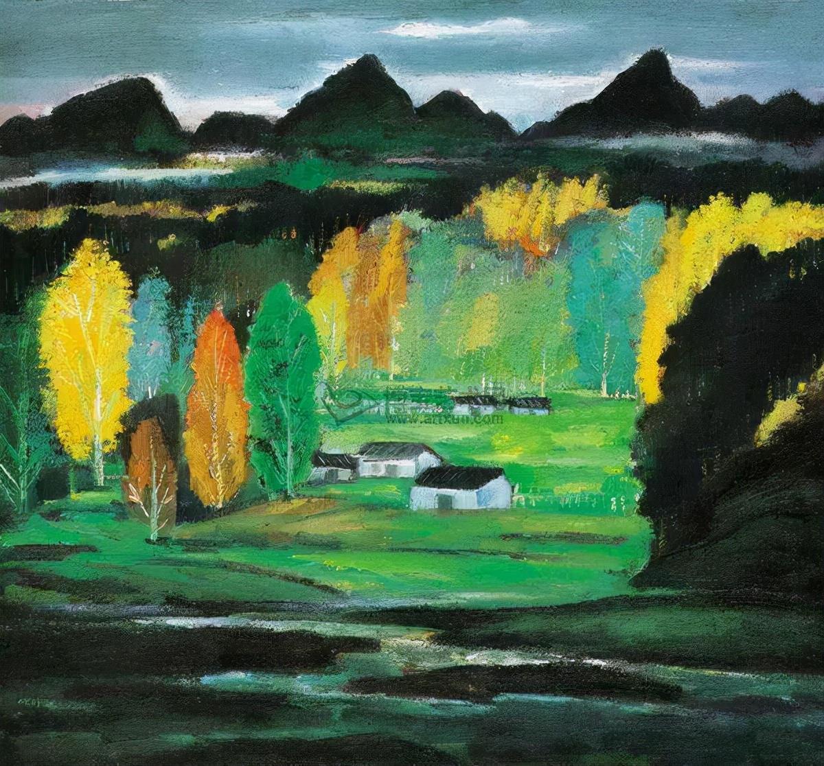 17、这幅画是林风眠于40-50年代完成的大幅油画创作,画中描绘的山村景致一如林风眠回忆家乡的情景,栩栩如生地呈现在眼前,正如学生吴冠中曾对老师的风景创作提出了他的观感:“林风眠的画是抒情诗,蕴藏著深远的意境,正因画中有诗,就不需额外题诗”。