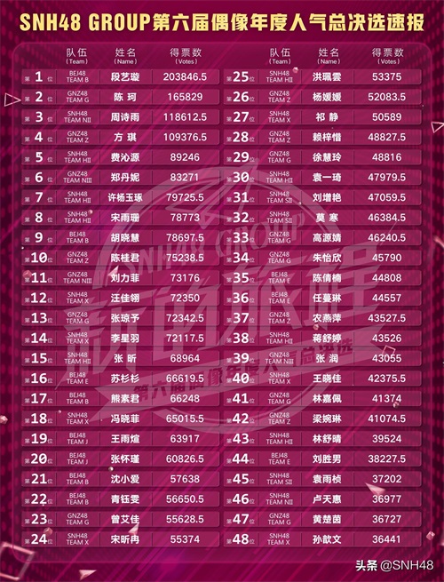 “新的旅程”SNH48 GROUP第六届偶像年度人气总决选速报TOP48成员完整名单: