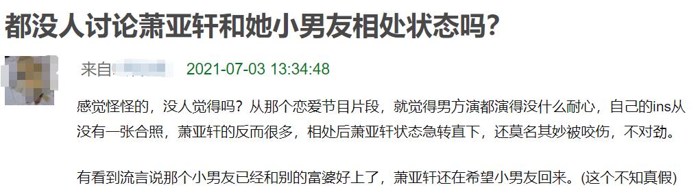 这个节目也暴露了这两人的一些问题,比如在一起3年,萧亚轩从没和男友的妈妈正式见过面,只用手机视频过。