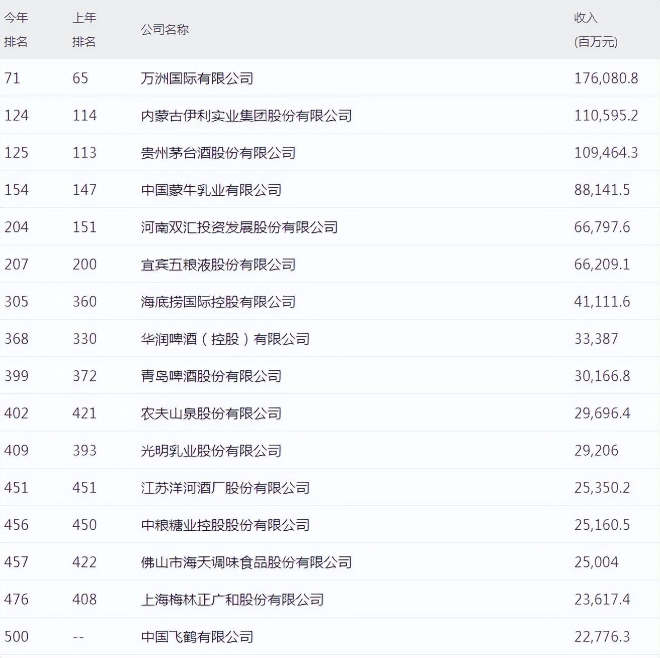蒙牛乳业(881.4亿,第154名)排在第5位,其他入榜的企业依次为双汇投资(668.0亿,第204名)、五粮液(662.1亿,第207名)、海底捞(411.1亿,第305名)、华润啤酒(333.9亿,第368名)、青岛啤酒(301.7亿,第399名)、农夫山泉(297.0亿,第402名)、光明乳业(292.1亿,第409名)、洋河酒厂(253.5亿,第451名)、中粮糖业(251.6亿,第456名)、海天味业(250.0亿,第457名)、梅林正广和(236.2亿,第476名),以及刚好排在第500名的飞鹤乳业(227.8亿)。