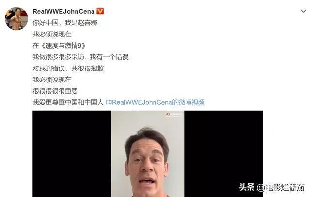 之后,约翰·塞纳马上在微博上用中文并配上视频正式道歉: