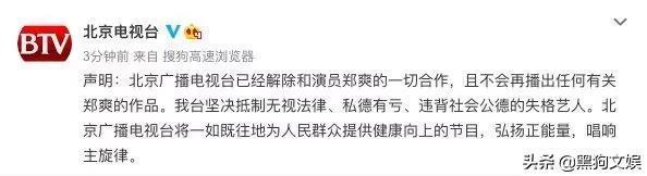 与郑爽有过多次合作的北京电视台发表声明:“北京广播电视台已经解除和演员郑爽的一切合作,且不会再播放任何有关郑爽的作品,我台坚决抵制无视法律、私德有亏、违背社会公德的失格艺人。”
