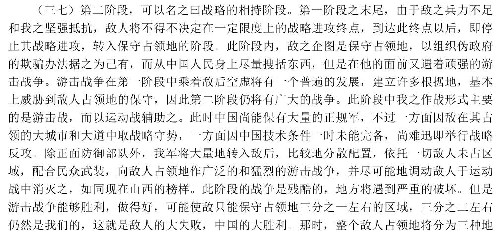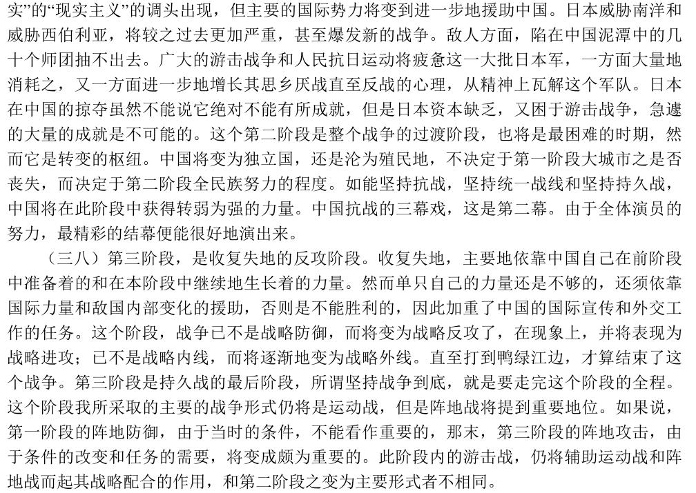 全文详细分析了中日双方的基本特点,从全国的战略全局出发,深刻地论述了抗日战争是持久战,必须经过战略防御、战略相持、战略反攻三个阶段,进一步揭示抗日战争发展的过程和规律,有力地批驳了“亡国论”和“速胜论”。在我看来,论持久战也是一部阳谋,它不仅为自己人所知,也为敌人所知,然而日本帝国主义即便知道也无法改变战败的命运。毛主席在论持久战中强调:日本是强国,中国是弱国,就决定了中国的抗日战争不可速胜;而另一方面日本是小国,其人力、军力、财力和物力均有所匮乏,经不起长期的战争,中国是大国,有着广袤的土地和庞大的人口,可以支持旷日持久的战争。