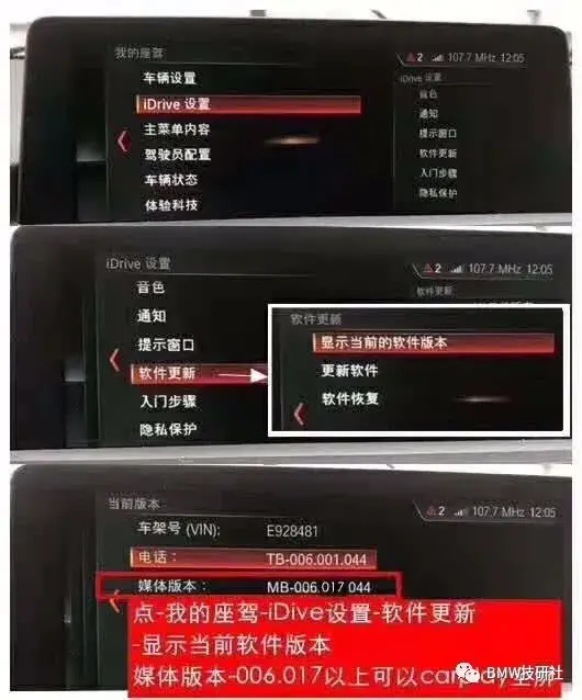 外面刷全屏的时候,会有一些条件限制,那就是进入idrive设置→软件更新→显示当前版本。车辆的媒体版本达到MB-006.017及以上,版本低于006.017的就要先编程升级,然后再刷全屏。