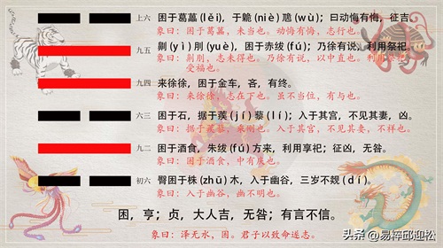 困处于藤蔓之间,于高危之地,这称为因行动而懊恼。有了这种悔悟,往前进就吉祥。《象传》说:困处于藤蔓之间,是因为位置不当。有了因行动而懊恼的这种悔悟,就可以前进吉祥。