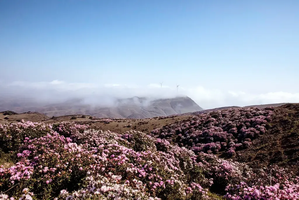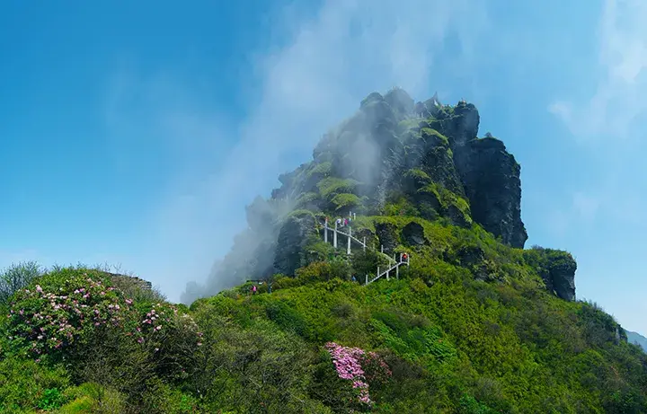 梵净山的杜鹃花比百里杜鹃的开得晚,每年五一假期开始,才是梵净山杜鹃的最佳赏花期。满山的杜鹃怒放时,花在云中开,云在花中绕,如同置身花海仙境。