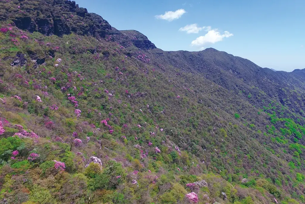 梵净山的杜鹃花属于高山杜鹃,喜欢生长在风大、冷湿地区。它是一种常绿矮林,密集成片,整齐生长,常与黄杨群落、冷杉铁杉林为邻,构成梵净山独特的风景线。