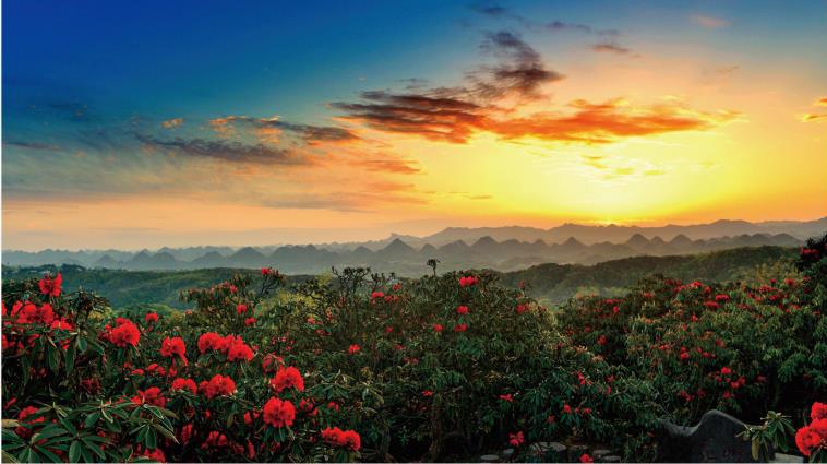 唐朝诗人白居易曾写杜鹃:“细看不似人间有。”用这句诗形容百里杜鹃再合适不过。每年春夏之交的盛花时节,登高远眺,群山逶迤,山间各色杜鹃花花团锦簇,云霞灿烂。