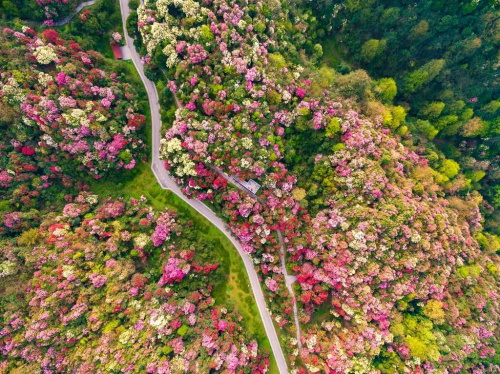 四百余亩杜鹃花竞相绽放,开满各个山头,姹紫嫣红,香气袭人,远远望去,似朝霞燃烧,令人沉醉。