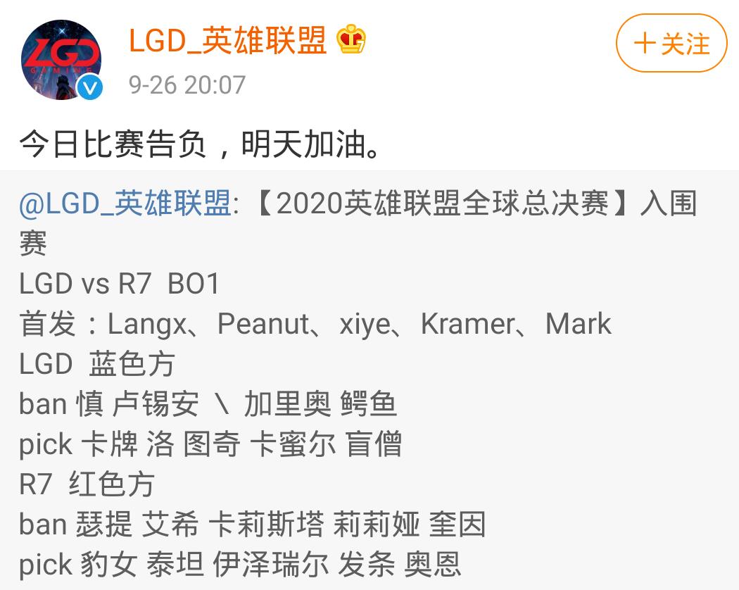 就在LGD输掉比赛之后LGD微博直接简短发文,说了一下今天比赛所使用的阵容,以及今天LGD比赛的胜负结果,顺便还给明天比赛加油。