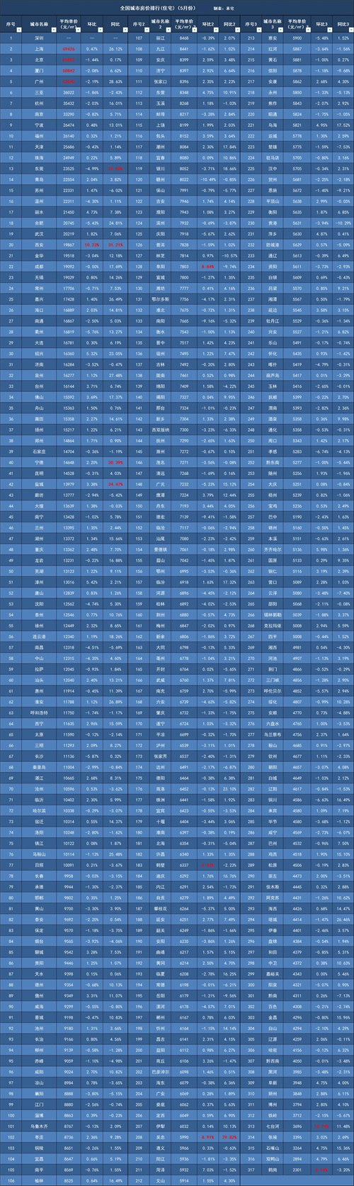 全国城市5月份房价排行(住宅)