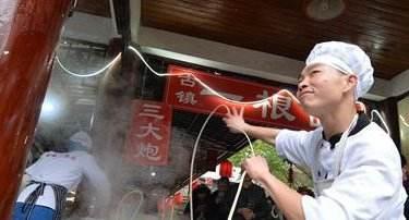 在黄龙溪,一根面光是下锅手法就有七种花样。靠着把式和吆喝,一根不足1厘米宽度的面条到底有多长呢?师傅说,一碗只有一根面,一锅也是一根面,一根面要多长有多长。