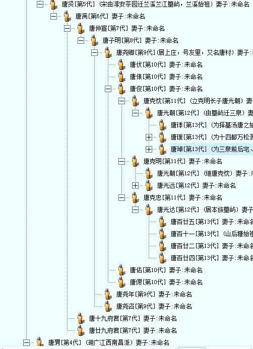 唐朝末年,先祖希颜公,字国荣,号休复,自河南方城而避地浙江余杭之杭山乡。其孙仁恭为水部员外郎,生四子,长涣,次渭,三润,幼洙。洙公次子贤迁居宋时由淳安茶园徙居兰溪兰江之篁屿,为兰溪始祖。后裔唐琸,生有四子,长昱、次韶、三森、幼元章。