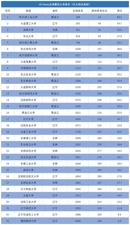 日前,U.S.News发布了2022—2023年度全球最佳大学排行榜。据了解,这份排名包含了全球2000所高等院校,其中中国内地有338所高校上榜,东北三省占33所,那么这33所高校具体的排名情况是怎样的呢?哪些高校的排名位次比较有争议呢?下面就来具体了解一下吧。
