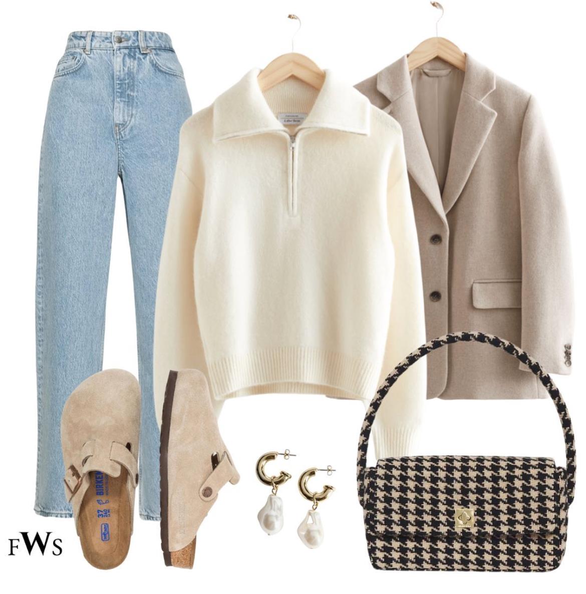 南方的冬天不会太冷,一件略厚实的呢子面料西装,再搭一件POLO衫款白毛衣,配合浅色系牛仔裤,职场女孩也能穿出元气风的感觉。很冷的日子在外面罩一件羽绒服就能出门。记得选择一些精致的配件,珍珠吊坠耳环,格纹挎包,显得休闲又优雅,很时髦的感觉。