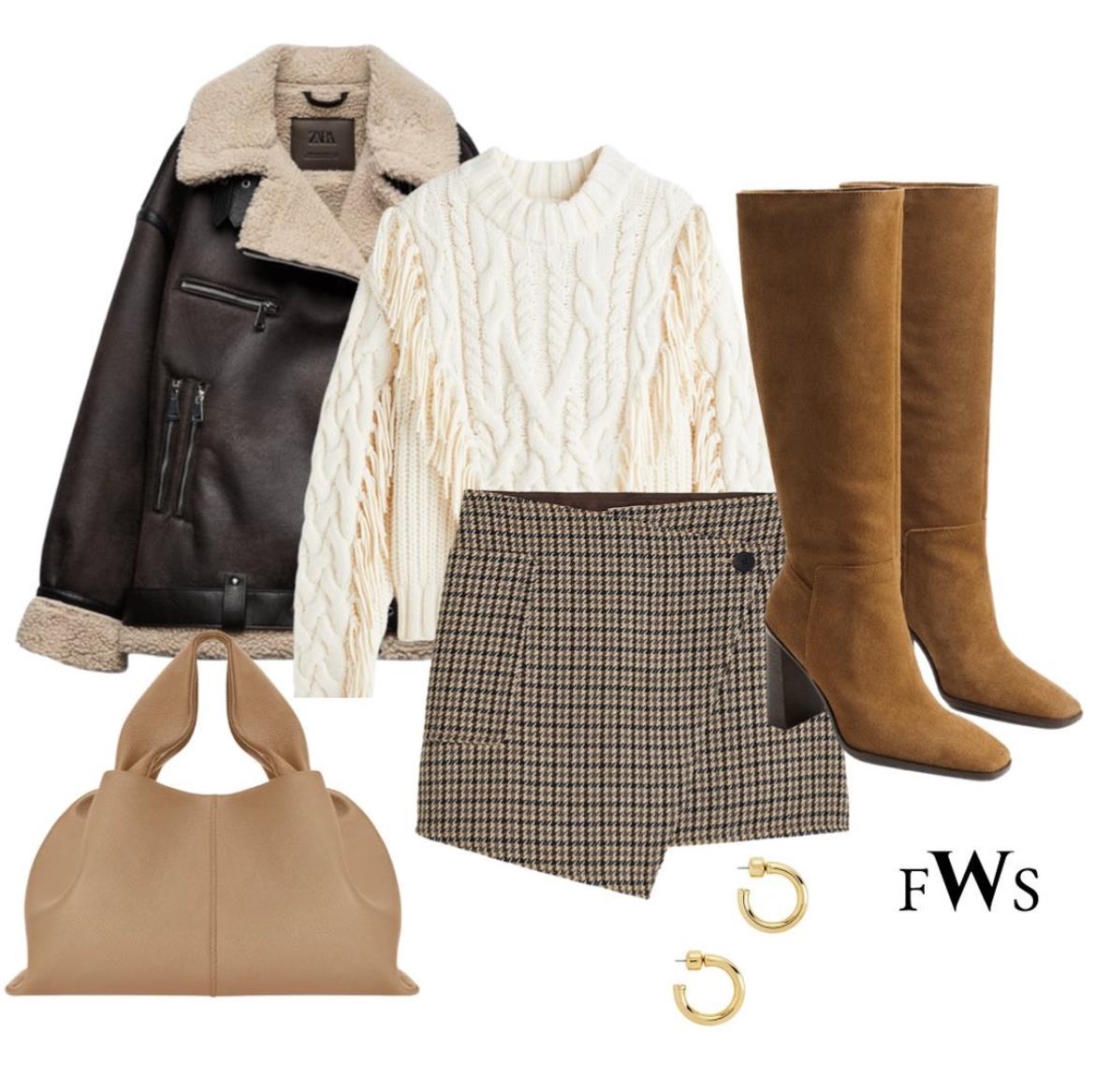 第二套白毛衣搭配可以走时髦俏女郎的风格,今年很流行的机车皮夹克,有暖和的羊羔绒内衬,搭配乖巧的编织感毛衣,圆领毛衫很活泼。再搭配格纹迷你短裙和一双长靴,很适合个性活泼,或是想在冬天穿出轻快俏皮感的女生。