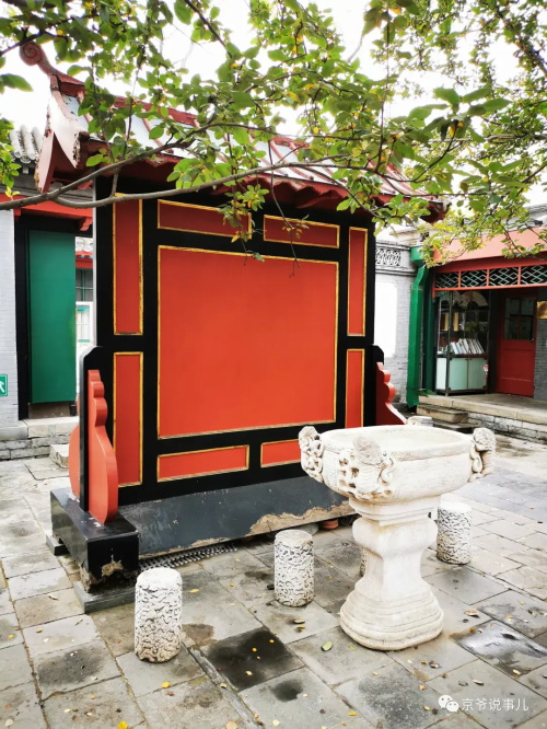 照壁在中国的风水学中原为辟邪及避免行人直接看到院内而设,但这面照壁与我原来见过砖瓦色照壁很不一样,是一面中国红颜色在装饰上粗黑的线条,让人联想到京剧的舞台装饰或京剧脸谱的线条。绕过这面红色的照壁,走进院内,但见花木扶疏、清幽典雅,令人觉得一股浓浓的京韵弥漫其间。