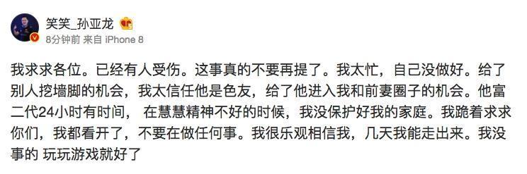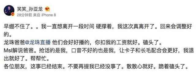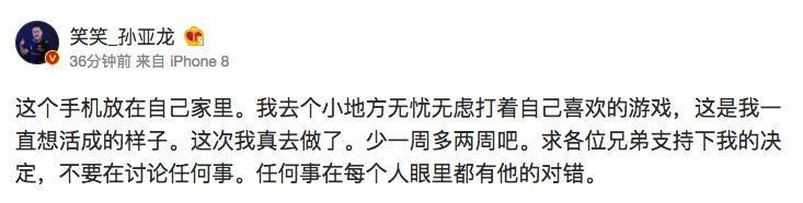 最后笑笑表示自己会休息一段时间,少则一周,多则两周,希望在这段期间不讨论任何事!