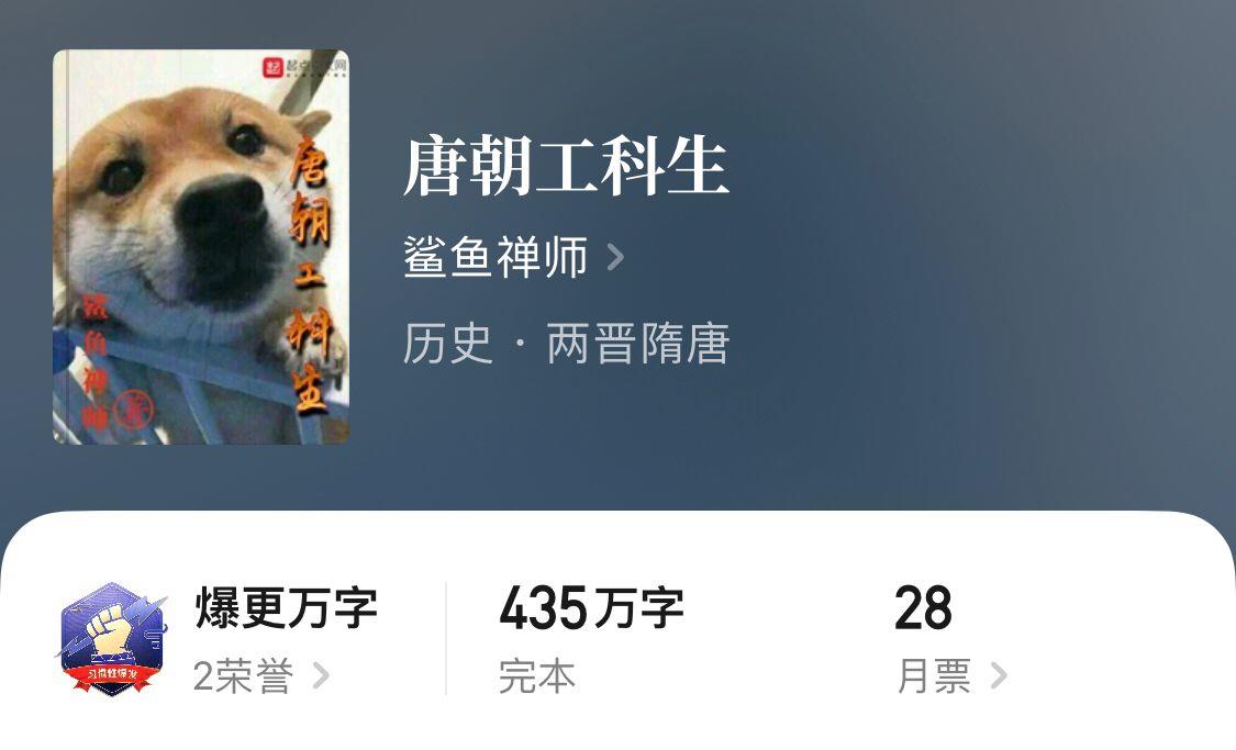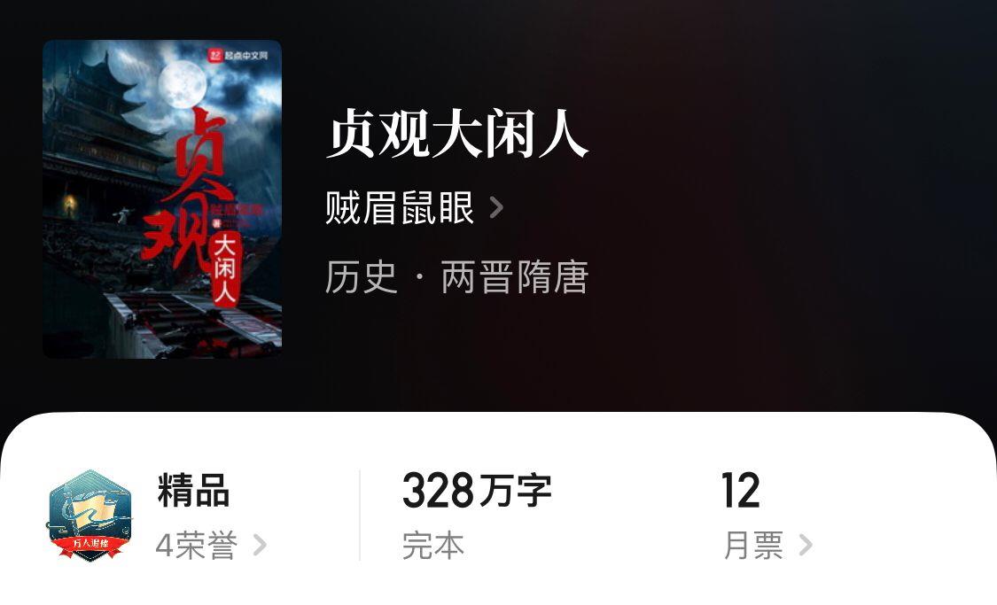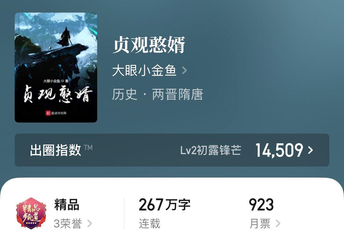 除了以上完本经典唐穿文之外,一本正在连载中的由大眼小金鱼所著的《贞观憨婿》,也有两百多万字了,比较肥了。