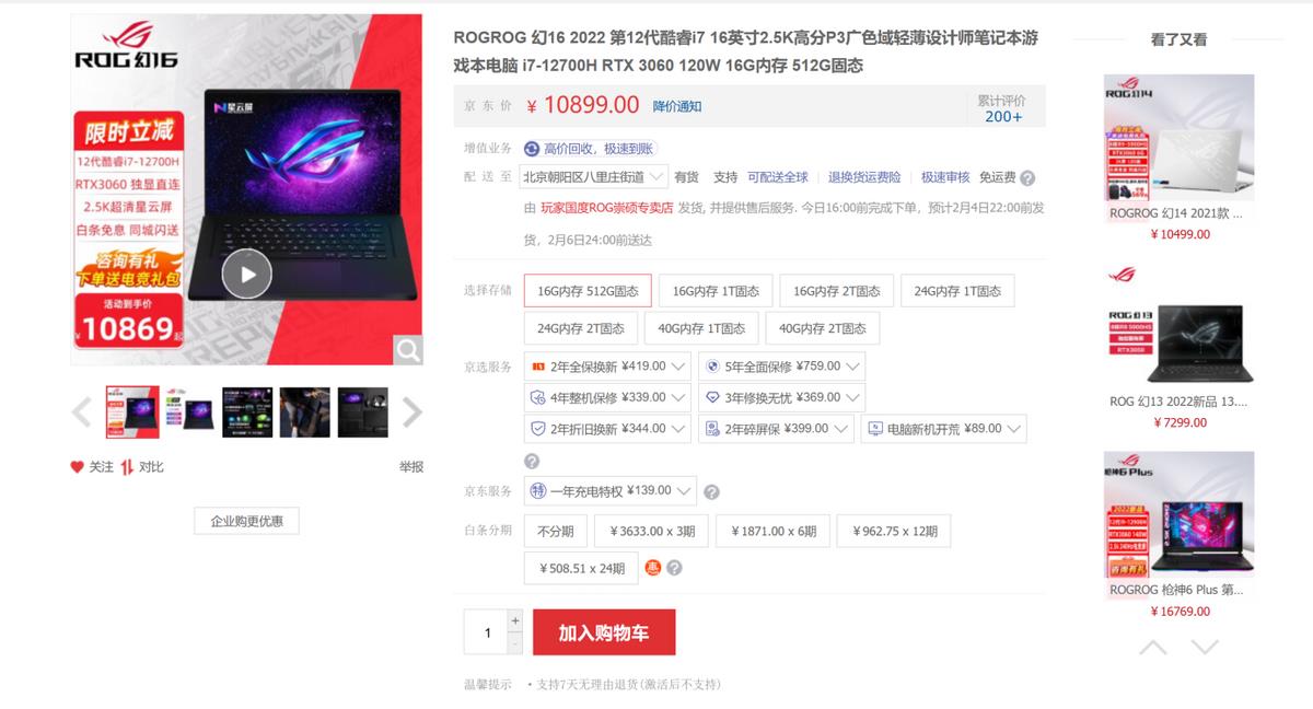 评价:ROG幻16主打高性能轻薄,14核20线程的i7-12700H+120W功耗RTX3060,支持独显直连,CPU附近还有液态金属导热,可以降低温度;标配 DDR5 内存,可以升级至40GB,预留M.2插槽,扩展性不错;此外,还有支持面部识别+100W PD充电设计。屏幕则是2.5K 165Hz P3色域的高分高刷屏,显示比例为16:10,500nit亮度,Pantone 专业色彩认证、支持杜比视界等,制图、观影、玩游戏等都有不错视觉体验。