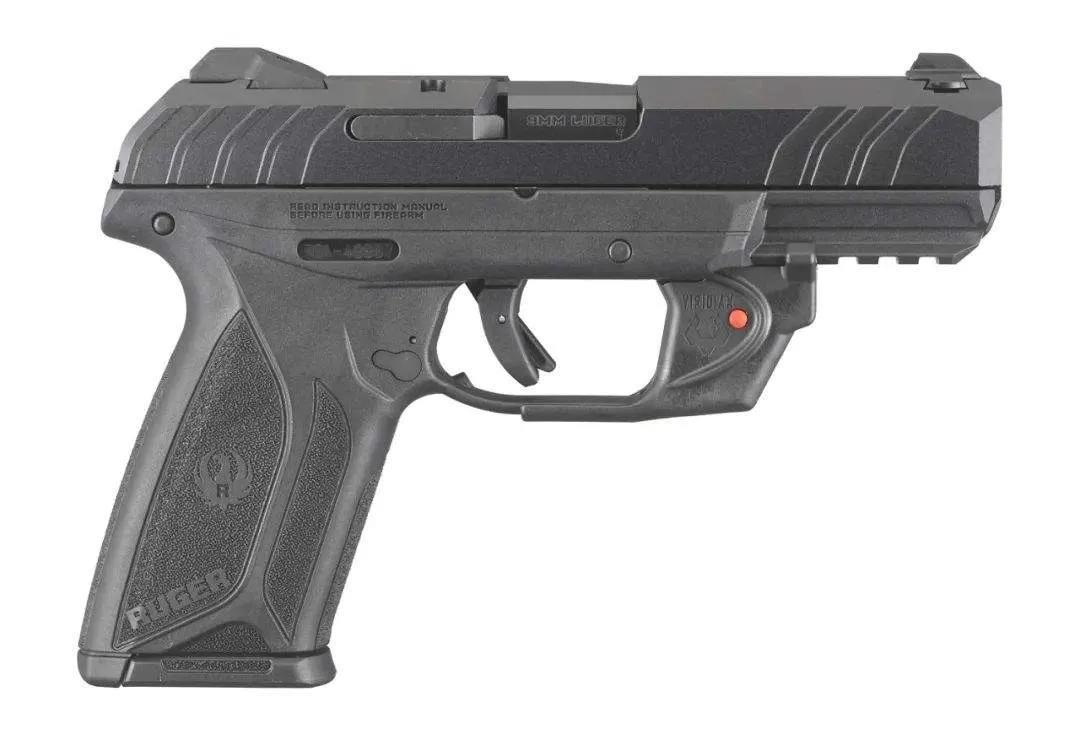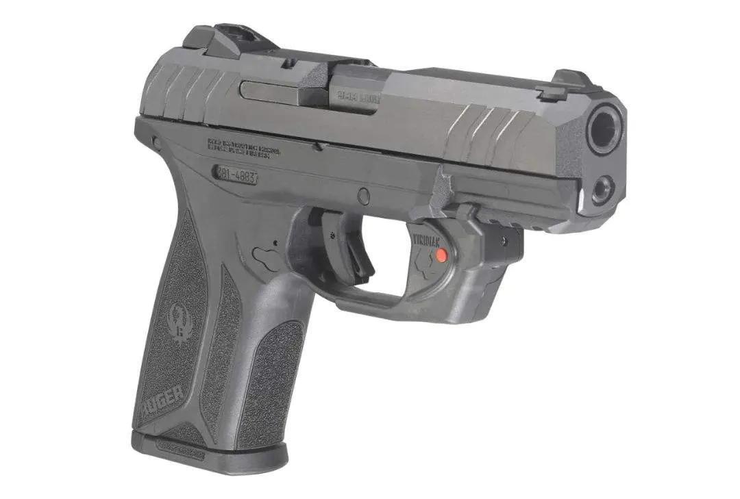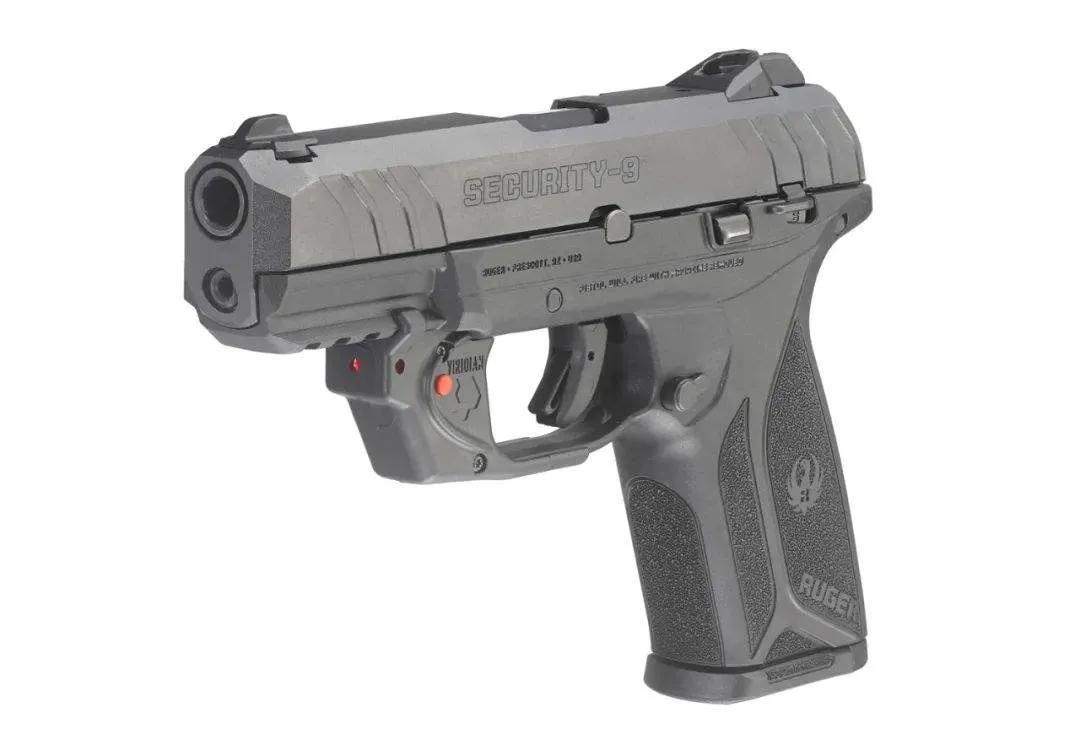 该枪的套筒也是钢制构件,而套筒座则采用聚合物材料,套筒的左侧刻有“SECURITY-9”字样,前部下方预留的战术导轨,可以让使用者按照需要和习惯安装战术灯、激光指示器等附件。而新版本鲁格安全9手枪则在扳机护圈的前方加装了专用的一体式激光指示器,两侧都设有比较显眼的红色按钮,以便于使用者进行开关。