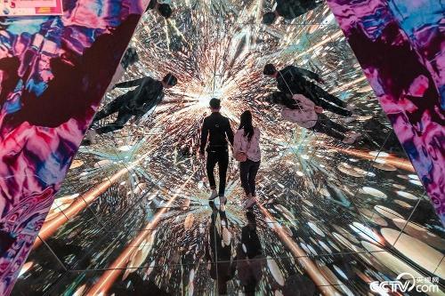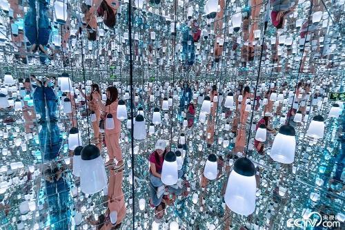 2020年5月13日,上海,走进南京路一商场内的星空艺术馆,多个酷炫的装置场景让人目不暇接。展馆大量运用镜面装置,结合声光电的布置,打造出让人叹为观止的视觉场景和空间效果,吸引了不少年轻人前来打卡拍照。