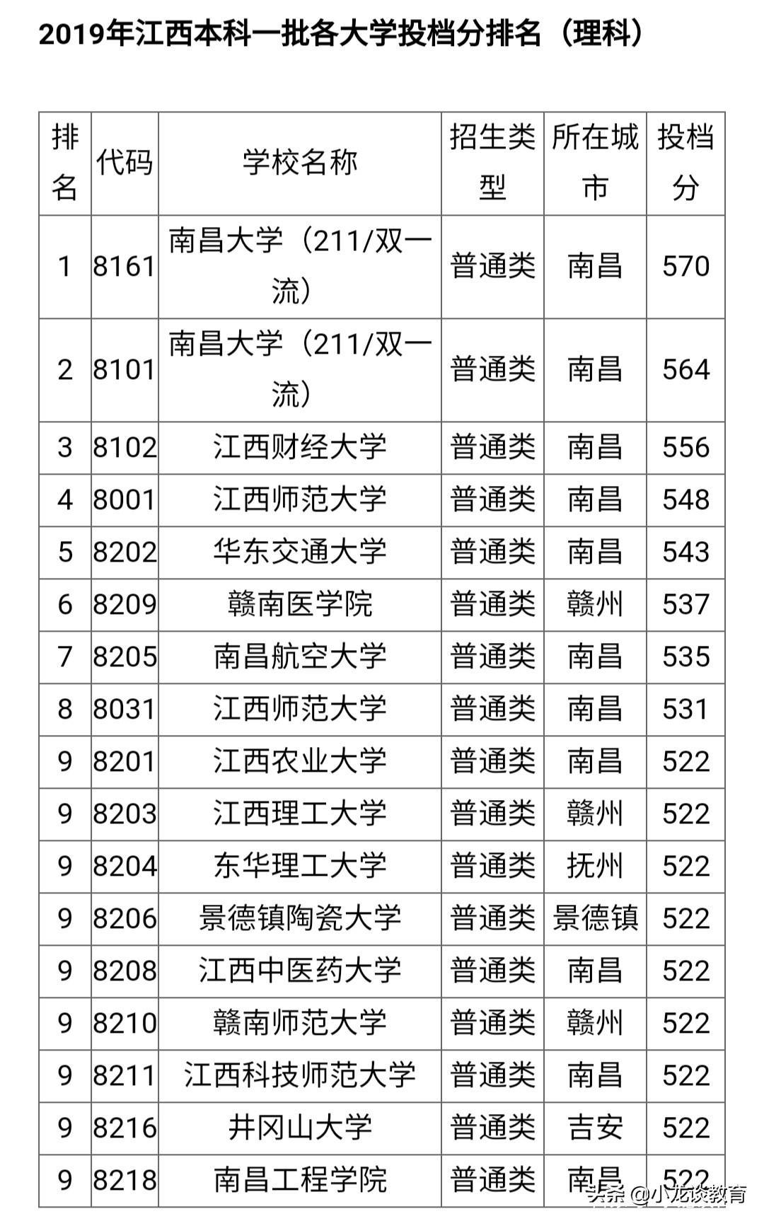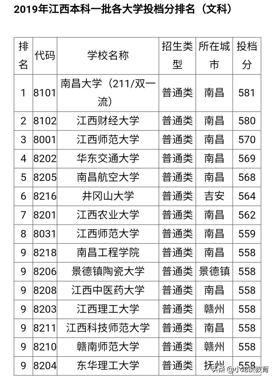 2019年江西省各一本院校分数线: