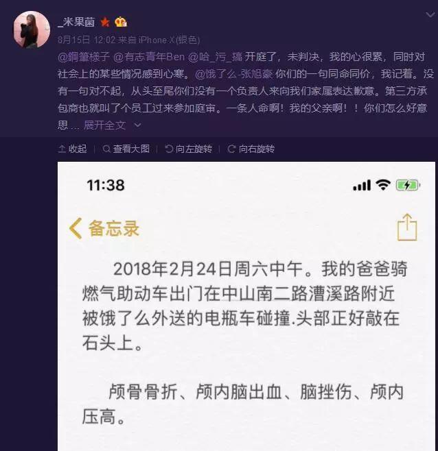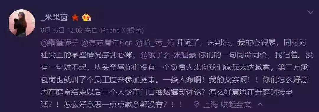 饿了么作为肇事方公司,事发后一直未表达任何歉意,而且肇事方人员在法庭上的态度更表现得极为轻慢,“一条人命,你们怎么好意思在庭审结束以后,三个人聚在门口抽烟嬉笑讨论?怎么好意思在开庭时接电话?怎么好意思一点点歉意都没有?”