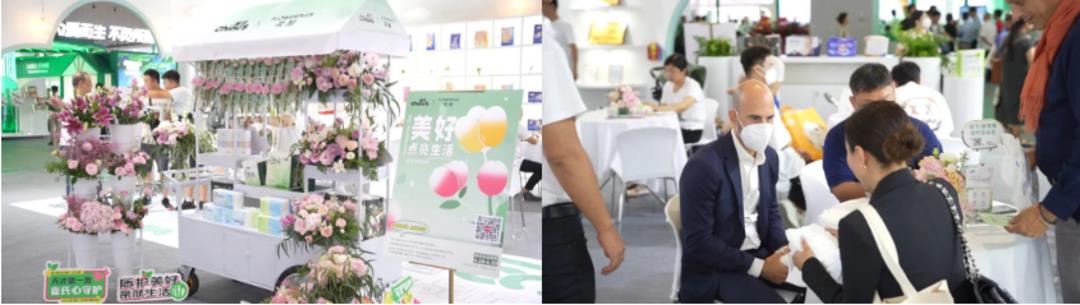 守护美好品质生活,助力构建和谐社会,今年雀氏联合鲜花品牌花加共同发起了以“美好,点亮生活”为主题的打卡活动,为前来展馆拍照留念的游客,派发专属手提花礼。活动第一天,展馆门口精致漂亮的花车,就成功吸引了一批观展游客,大家络绎不绝地加入到打卡活动中,现场人气满满。另外,雀氏展馆外的品牌故事墙和金句打卡墙下,也是热闹非凡,时不时就会有人来打卡拍照。