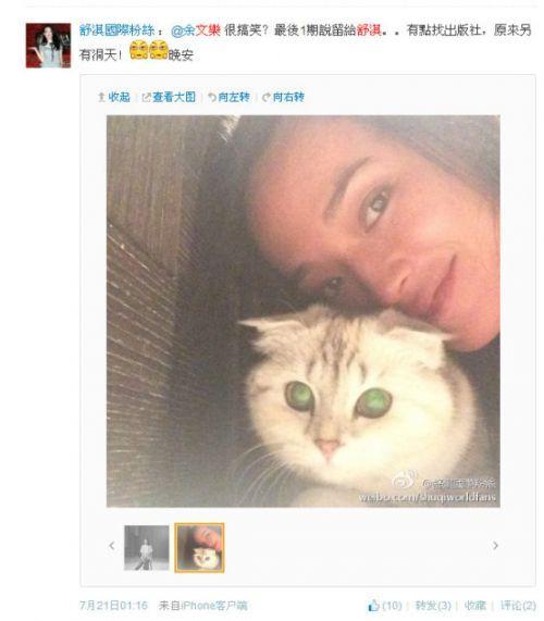 最最关键的就是9月10日遮天晚上,余文乐发了一个晚安的微博,微博配图就是舒淇的那只猫,如果说照片是当天晚上现场拍的,那么就能证明那晚舒淇也一定在。如果那张照片不是当天现场拍得也可以理解成是在对舒淇说晚安。