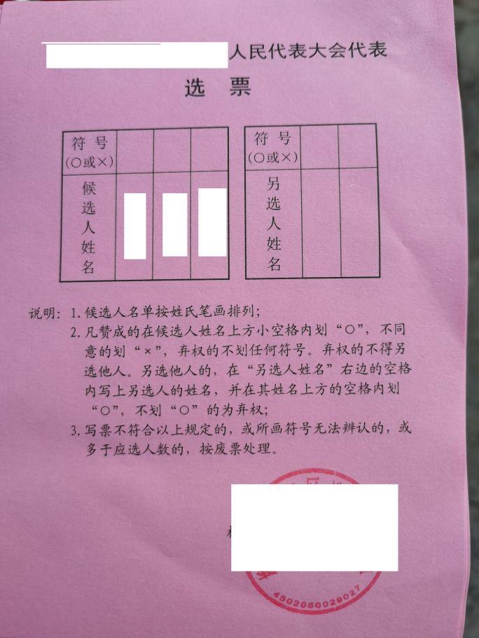 这就是选票了,本次选举选出一个镇人大代表(黄色)和2个区的人大代表(红色)