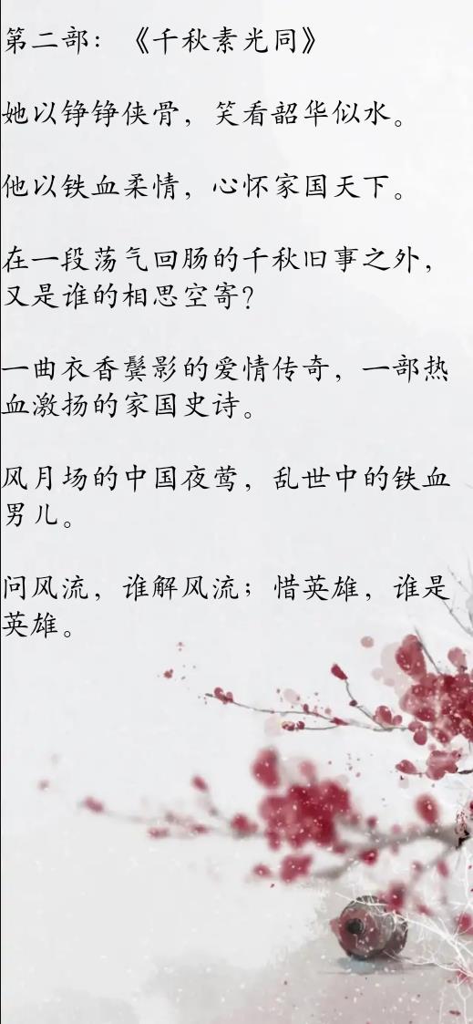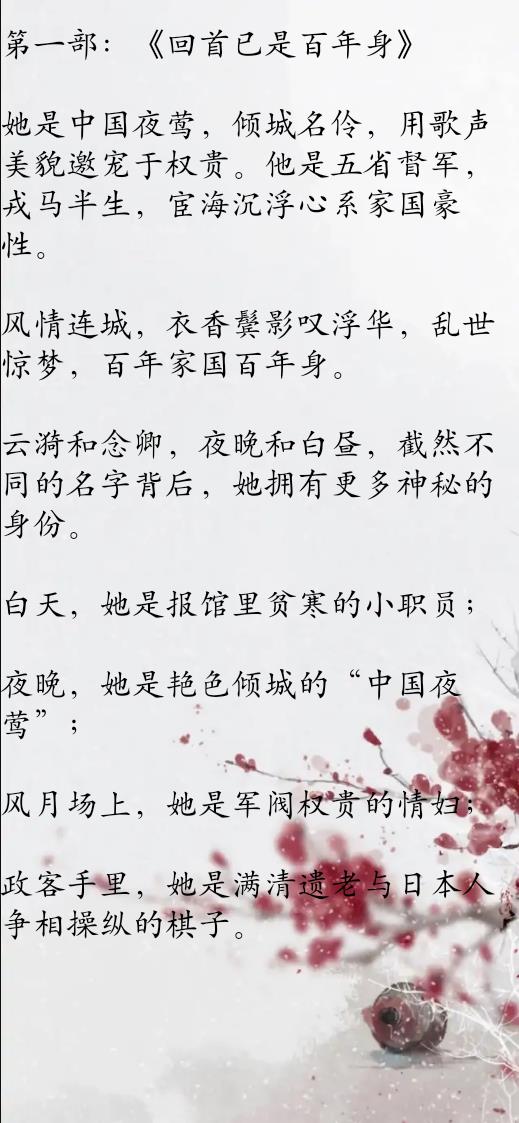 衣香鬓影叹浮华,千秋明月百年身。从北洋时期到南北统一,从抗战爆发到国共内战,从去国离乡到隔海相望;从衣香鬓影的南国到风云变幻的北平,从遗世偏安的香港到血火重生的陪都重庆;从漂泊海外的孤女到双重身份的棋子,从一代名伶云漪到督军夫人霍沈念卿;从一九一九年到一九九九年——在起点与终点重叠的地方,茗谷的白茶花再度盛开;她,自一个世纪之外缓缓走来。