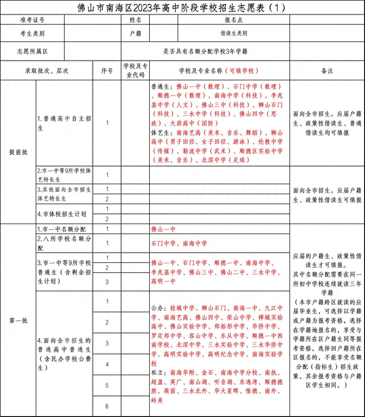 首先看看2023年南海区的中考志愿填报表(附可填报学校和要求),今年志愿表改革,由原来的先录普通生在录指标生改为先录名额分配(指标生),再录普通生