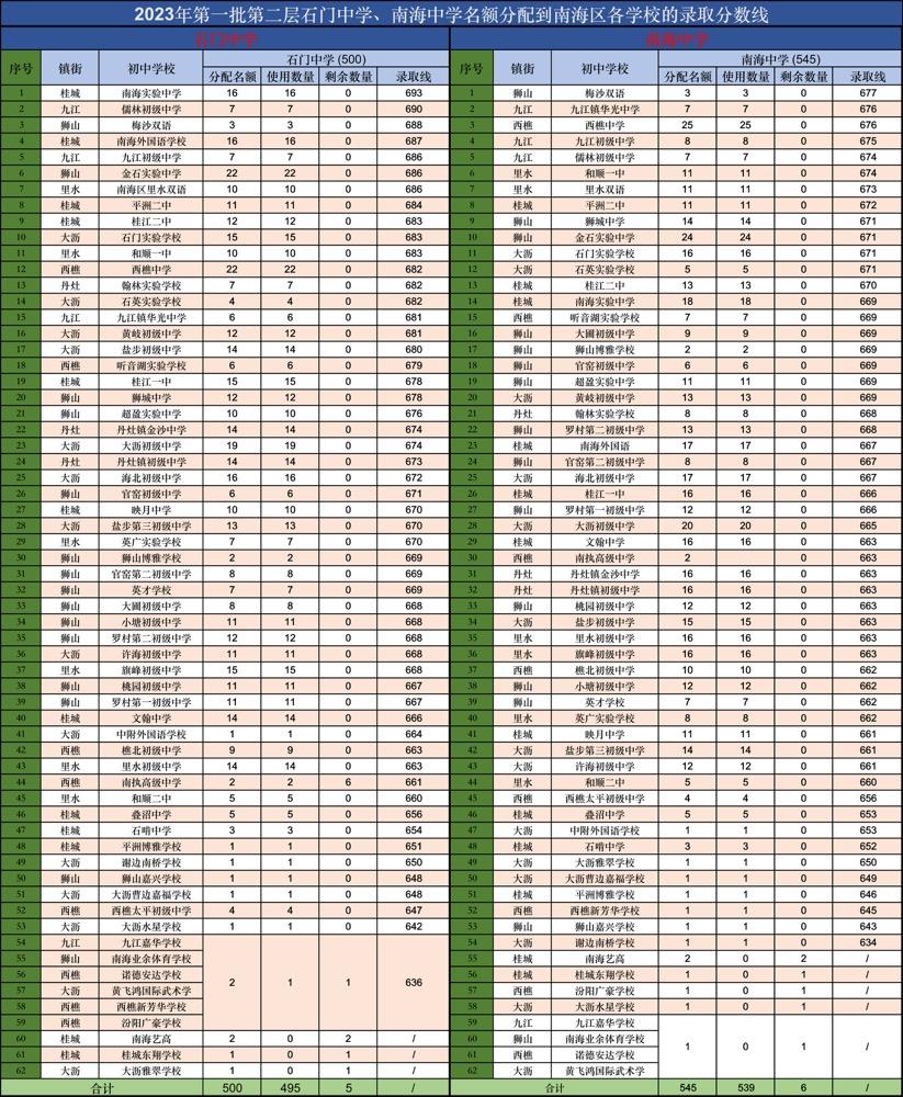 2. 2023年第一批第二层石门中学、南海中学名额分配到南海区各学校的录取分数线