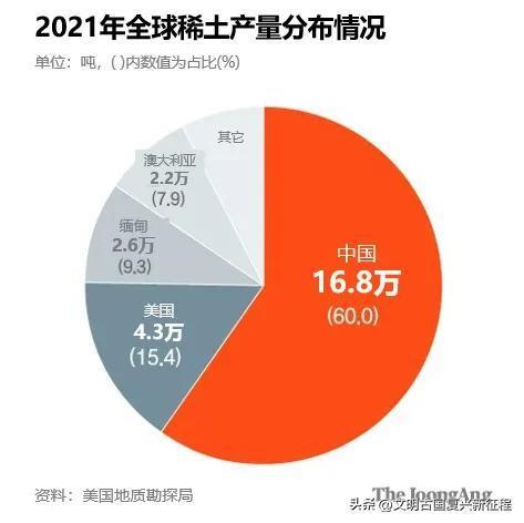 我国掌控着稀土生产话语权。根据美国地质勘探局(USGS)的数据,以2021年为准,全球稀土产量中,我国占比达60%,其后依次是美国(15.4%)、缅甸(9.3%)、澳大利亚(7.9%)。
