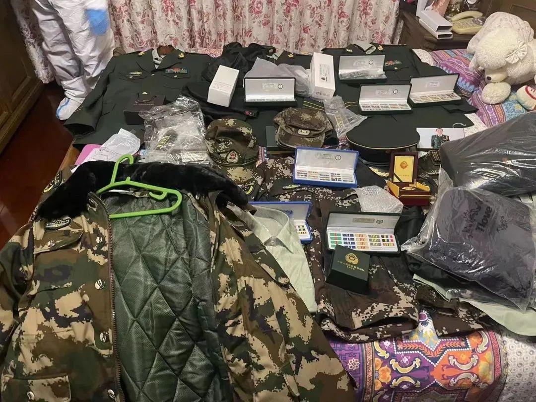 经审讯,童某某交代,其为某物流公司员工,是个军迷。近期,为了满足自己的虚荣心,同时也哄家里父母开心,便从网上购买了大量的假冒的军服、军衔、奖章、证书等,用“师长”身份自居,以此提升满足感。在其住处,民警当场搜出了大量的作案用品。