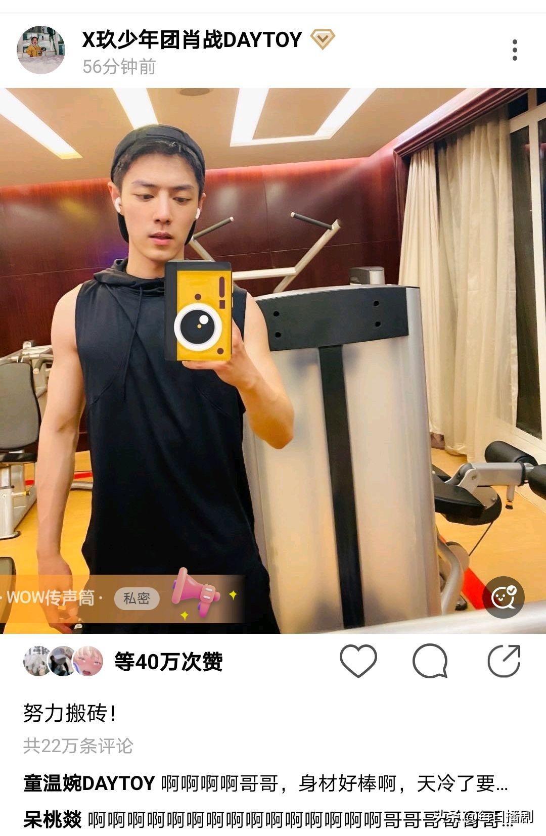 肖战在健身房发文晒肌肉,并配文字“努力搬砖”,好身材一览无余