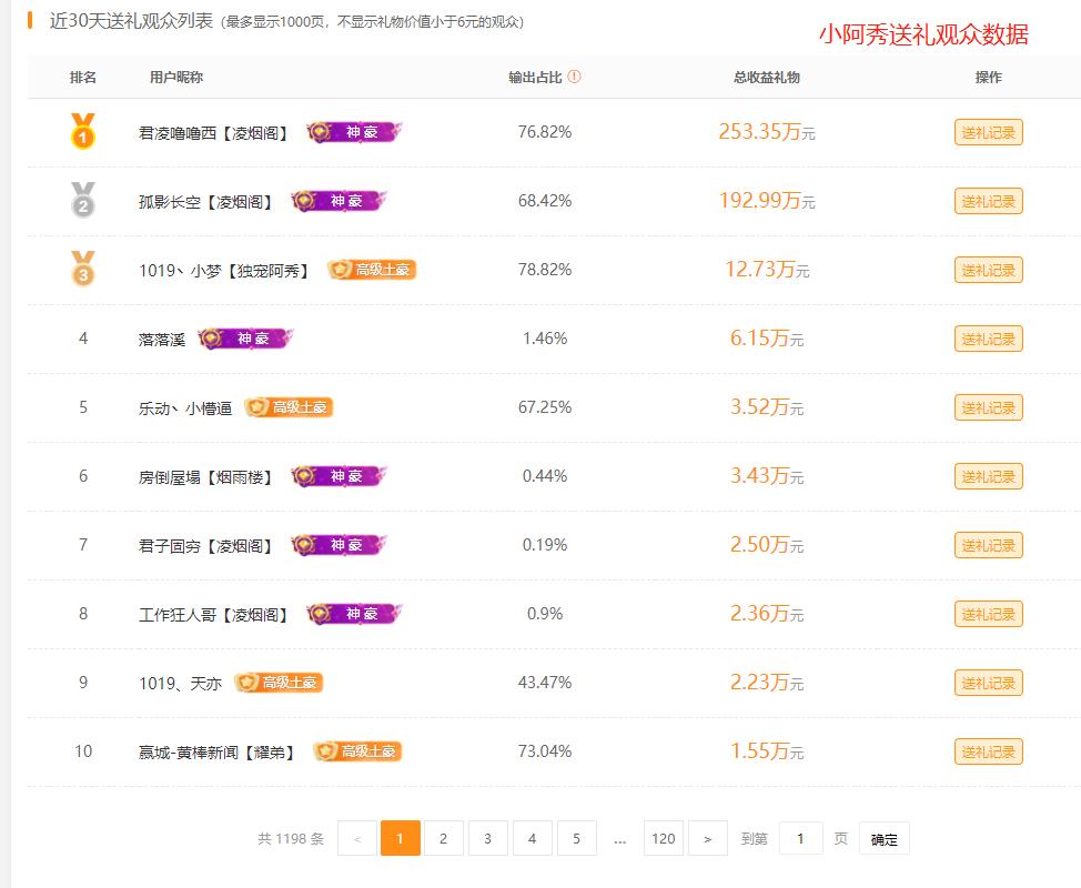 数上表现较弱的小阿秀,土豪人数也同样不高。而她之所以还能够登上本期榜单,是在于多位凌烟阁神豪的大额输出。头榜统计近三十天小阿秀直播间中送礼前十名的观众,四位来自于凌烟阁,排行前两位输出金额均在百万元以上,成为小阿秀上榜的最大支持者。