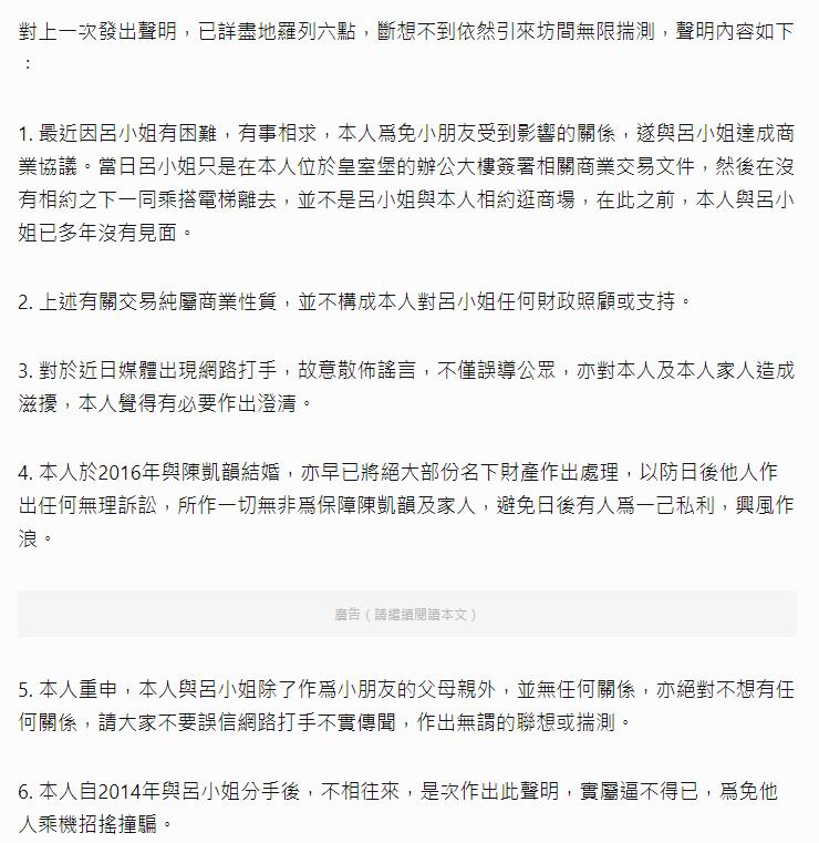 对于网络上的传言,刘銮雄曾发布声明否认和吕丽君复合,他在声明中提及六点,透露是吕丽君有困难、有事相求才见面,两人没有约会逛街,而是在商场签完合同就离开,强调合同是商业性质,并没有给予吕丽君经济支援,称两人分手后未曾再见面。