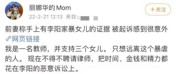 近日,李阳家暴女儿的事件又传来新消息,李阳前妻Kim在社交平台发长文回应自己被李阳起诉侵权一事,引起网友围观。在长文中,此次Kim讲述了自己目前还在学校当老师,还要养孩子和聘请律师应对起诉,周旋于众多事件之间非常忙碌,还喊话李阳的律师周兆成称呼其客户是个骗子,强调对方虐待她和孩子们。