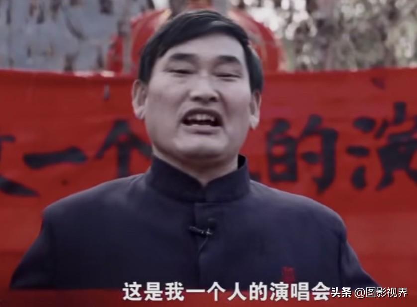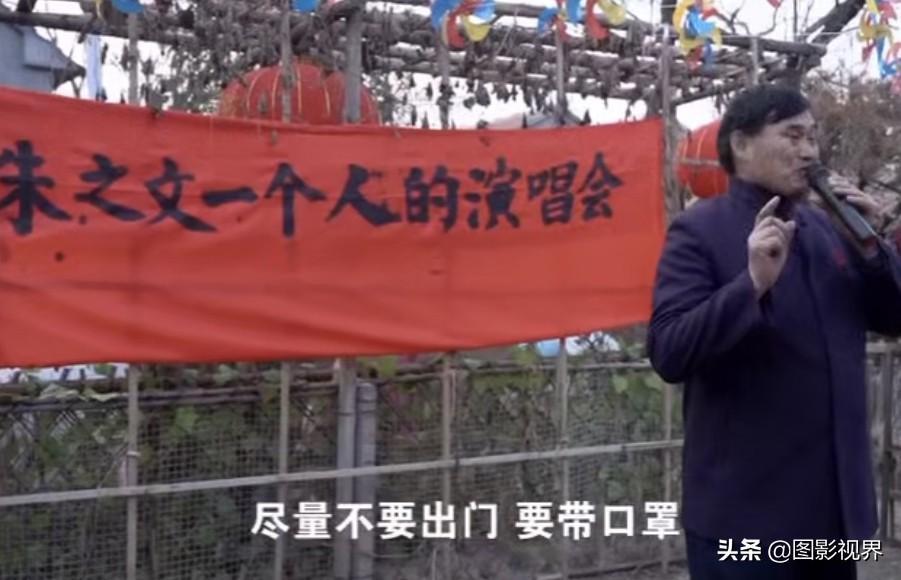 朱之文手拿话筒站在户外,前面有音响,后面是一块手写的幕布——“朱之文一个人的演唱会”。台下空无一人,但他却激情满怀。