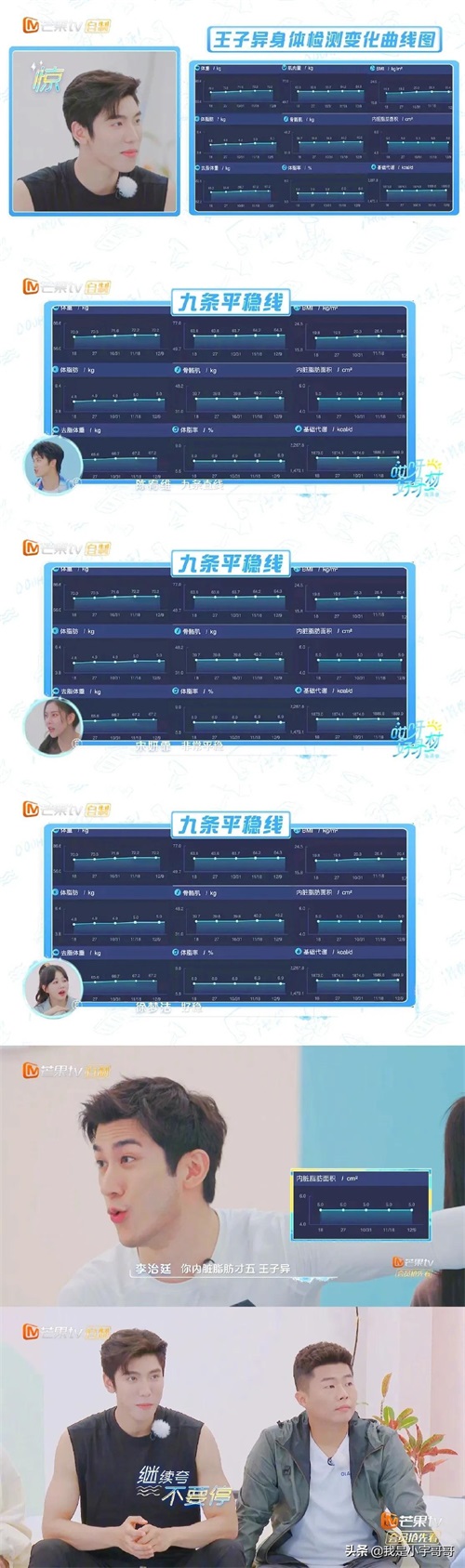 王子异不仅眼神深邃迷人,轮廓优越超模感,而且还是健身达人,曾经参加综艺节目《哎呀好身材3》,他的体测数值结果震惊众人,九条平稳线让人忍不住赞叹"自律狂魔",内脏脂肪数值仅5,且在肌肉量已经非常高的情况下依旧稳步增加了0.5,这自律能力也是天花板了。